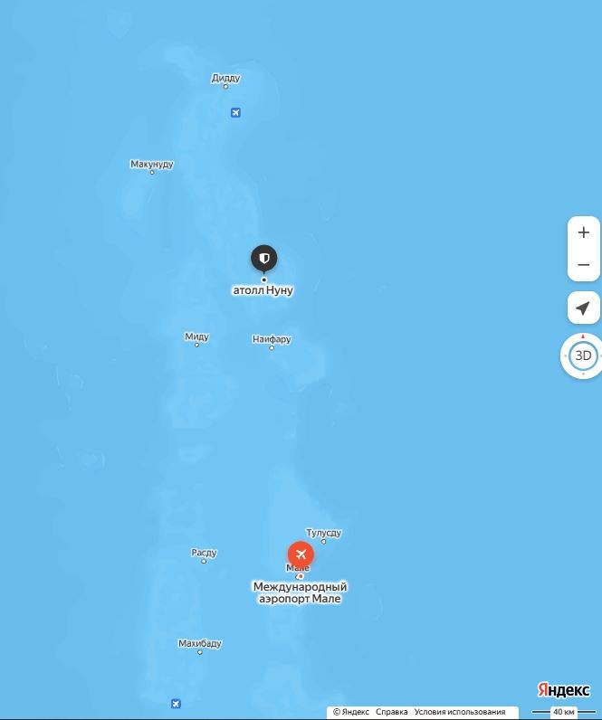 Роскошный Атолл Нуну Мальдивы расположен примерно в 170 км к северу от столицы Мале, на южной окраине самого северного географического атолла Мальдивских островов и находится в 45 минутах полета на гидросамолете от международного аэропорта.